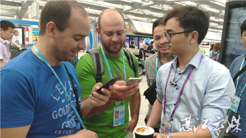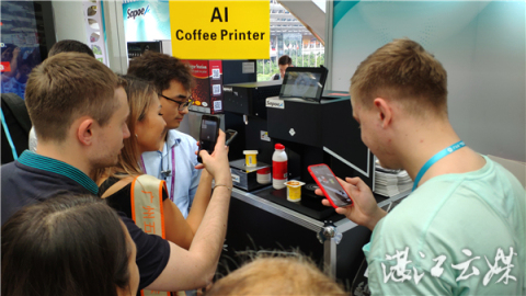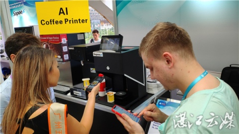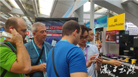 “看!我上傳了自己的照片后,才幾秒鐘的時間,咖啡拉花就做好了,非常逼真,很好玩。”一位外國友人現場按照工作人員指引,現場操作了一番,馬上端出了一杯印著自己頭像的咖啡,引得周圍的友人和客商紛紛點贊、拍照。
