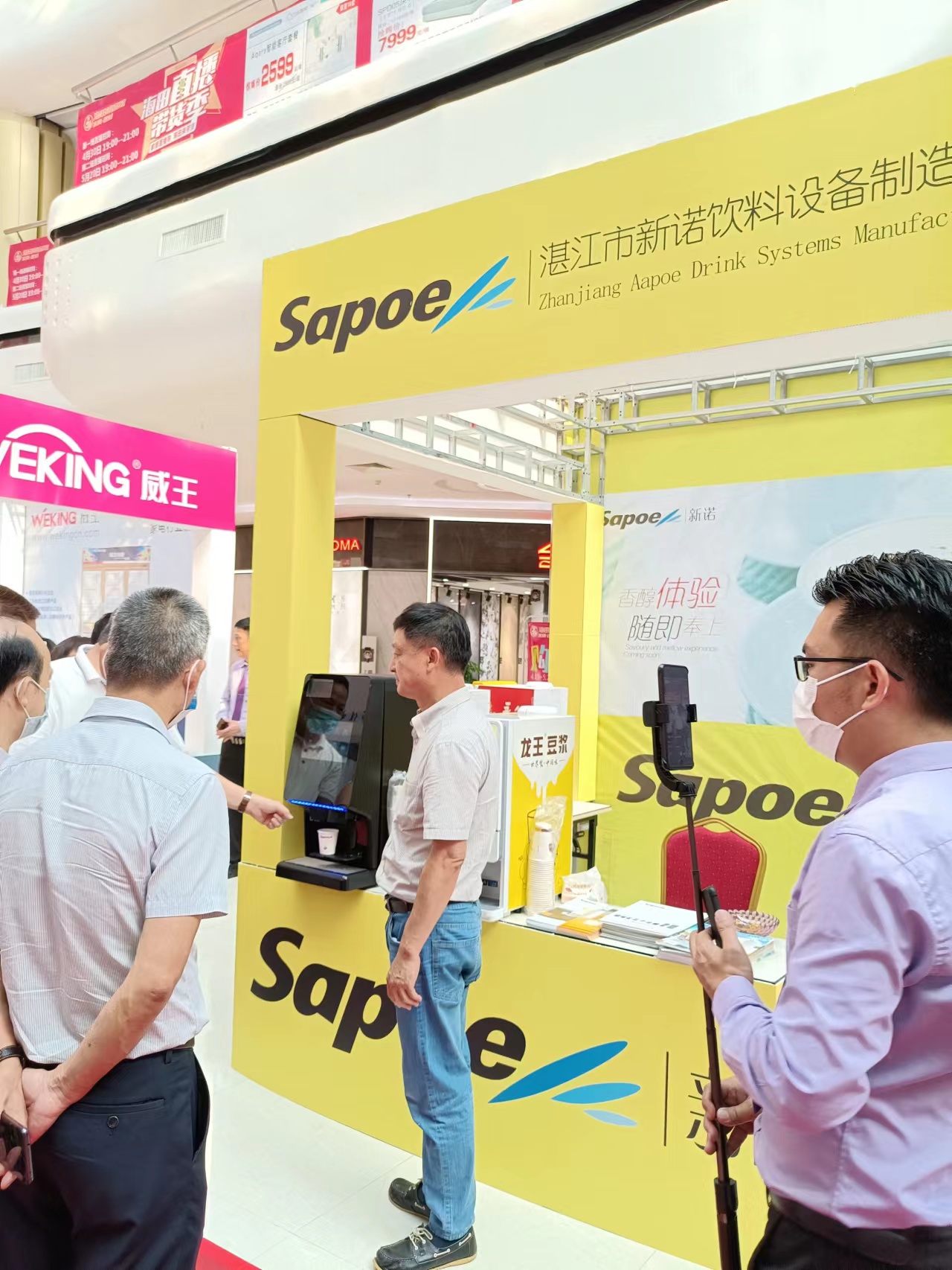 海田精品館展會(huì)現(xiàn)場(chǎng),Sapoe新諾所展出咖啡機(jī)和豆?jié){機(jī),吸引了眾多參展商、客戶、供應(yīng)商前來(lái)參觀、咨詢、洽談。其中由Sapoe新諾自主研發(fā)、設(shè)計(jì)的豆?jié){機(jī)更是成了爆款。